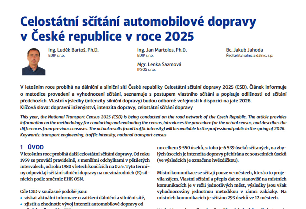 Článek v celém znění: Bartoš, L., Martolos, J., Sazmová, L., Jahoda, J.: Celostátní sčítání automobilové dopravy v České republice v roce 2025, Silniční obzor 2025/5 (formát PDF; 0,7 MB).